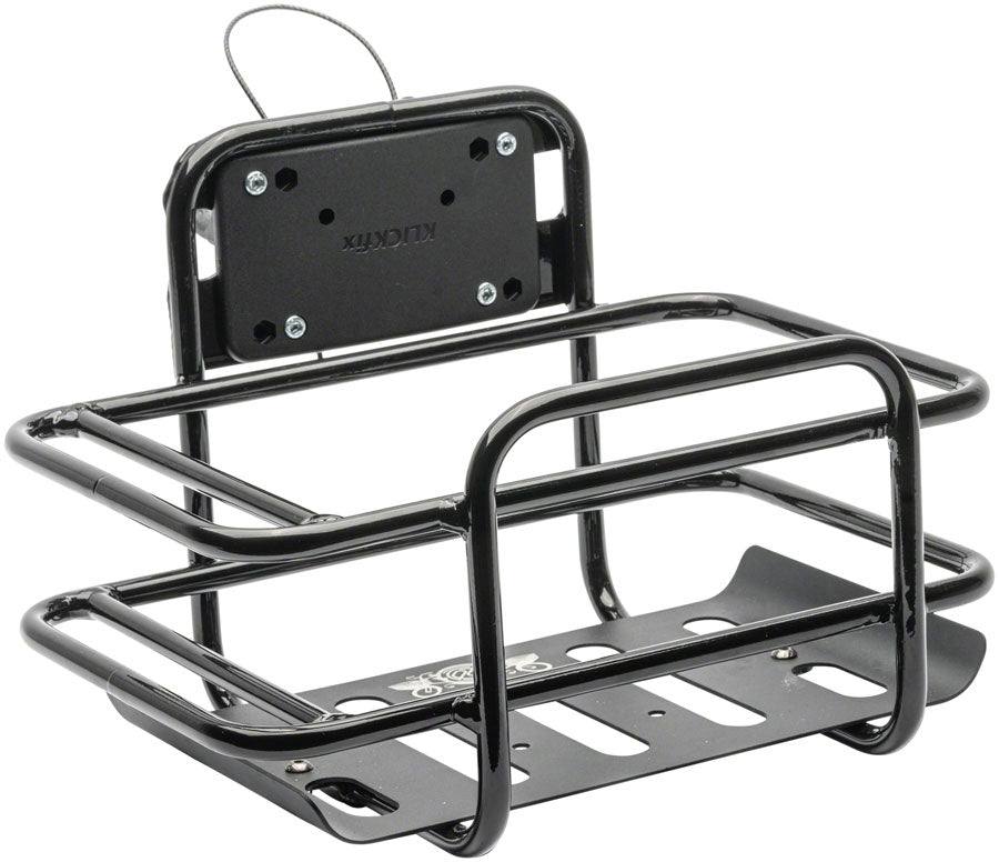 PDW Bodega Basket features all-aluminum construction for all-weather durability. Easy to use Klickfix bracket securely holds rack to handlebars and allows easy removal for shopping. Integrated lock holder